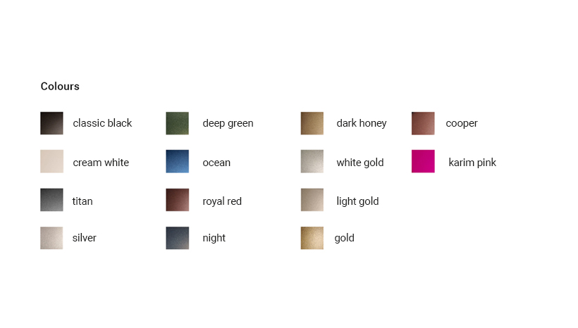 Wählen Sie aus über 14 speziell für diese Kollektion zusammengestellten Farben. Entdecken Sie klassische Grautöne und Cremeweiß, exzentrische Goldtöne oder subtile, aber tiefe Blau- und Rottöne.
