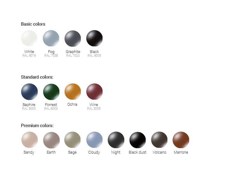 Eine breite Farbpalette ermöglicht es, die Profile sowohl an asketische als auch an eklektische Innenräume anzupassen und eklektische Innenräume. Sie können zwischen sechzehn farben wählen.