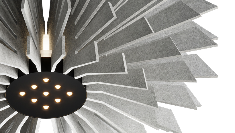 FarbenMone ist eine hochleistungsfähige Akustikleuchte, die außergewöhnliche Schallabsorption mit fortschrittlichen Beleuchtungsfunktionen kombiniert. Ihr markanter, gerippter Lampenschirm beherbergt eine Multicone-Lichtquelle, die eine fokussierte Spotlight-Beleuchtung bietet. Das Design wird durch eine stimmungsvolle Ambiente-Beleuchtung in drei Farbvarianten ergänzt, die die geschichtete Filzstruktur sanft hervorhebt und ihr zusätzliche visuelle Eleganz verleiht. Mone ist in vier Varianten erhältlich und bietet Individualisierungsmöglichkeiten in einer breiten Palette von Farben und Formen, passend für eine Vielzahl offener Räume.