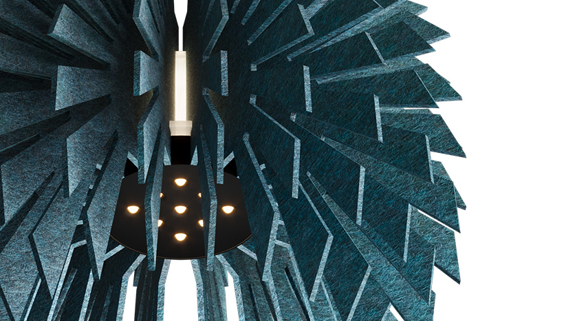 FarbenMone ist eine hochleistungsfähige Akustikleuchte, die außergewöhnliche Schallabsorption mit fortschrittlichen Beleuchtungsfunktionen kombiniert. Ihr markanter, gerippter Lampenschirm beherbergt eine Multicone-Lichtquelle, die eine fokussierte Spotlight-Beleuchtung bietet. Das Design wird durch eine stimmungsvolle Ambiente-Beleuchtung in drei Farbvarianten ergänzt, die die geschichtete Filzstruktur sanft hervorhebt und ihr zusätzliche visuelle Eleganz verleiht. Mone ist in vier Varianten erhältlich und bietet Individualisierungsmöglichkeiten in einer breiten Palette von Farben und Formen, passend für eine Vielzahl offener Räume.