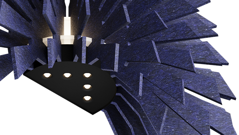 Mone bietet dank ihrer einzigartigen, gerippten Struktur außergewöhnlichen Komfort sowohl in Bezug auf Akustik als auch auf Beleuchtung. Das innovative Design mit mehreren Paneelen aus hochwertigem PET-Filz absorbiert effektiv Schall über einen breiten Frequenzbereich und trägt so zu einer ruhigeren und angenehmeren Umgebung bei.