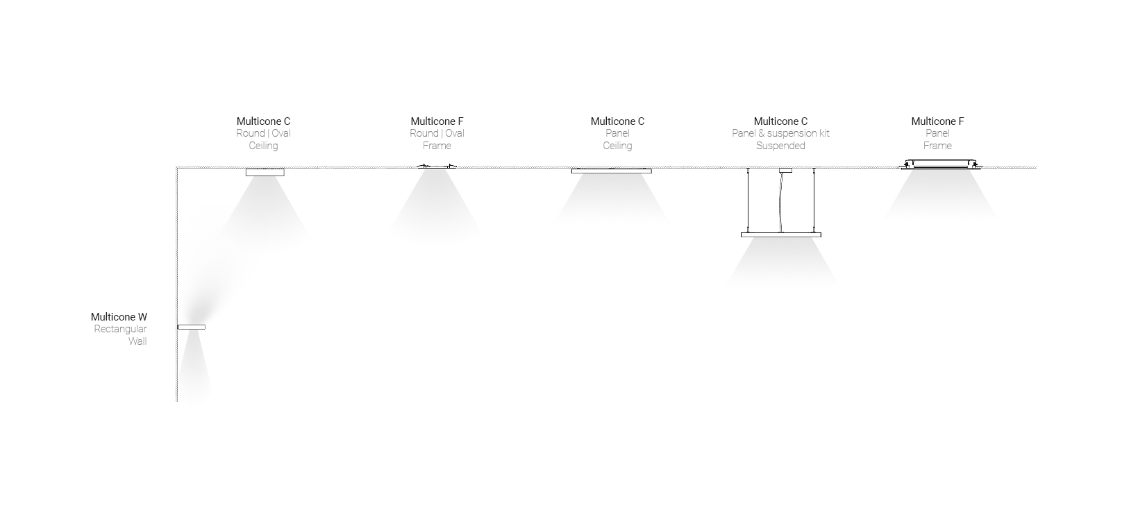 Vier Arten der Montage von Multicone-Leuchten helfen dabei, die anspruchsvollste Einrichtung jedes Raumes zu realisieren.