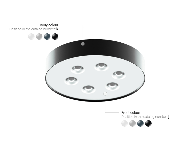 Die aus Stahl gefertigten Multicone-Leuchten sind in vier Farben erhältlich: Weiß, Grau, Graphit und Schwarz. Das Gehäuse und die Front können in der unterschiedlichen oder in der gleichen Farbe sein.