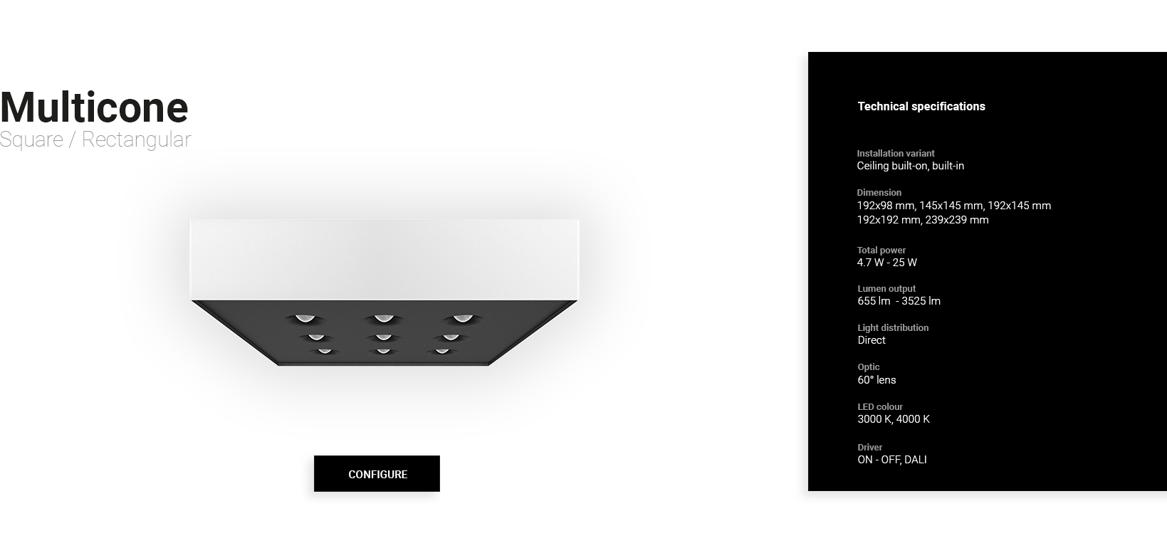 Die Familie der Multicone-Leuchten vereint eine Vielzahl von Kombinationsmöglichkeiten, einen minimalistischen Entwurf und moderne Technologie im Rahmen eines attraktiven Designs auf der Basis von Vierecken und Ovalen. Die Leuchte wurde mit der innovativen Multicone-Technologie entworfen, bei der die zurückgesetzte Linse und LED-Quelle in einer mechanisch geformten Front verankert ist. Dank dieses Verfahrens erzielt man die Wirkung einer natürlichen und für das Auge gesunden Lichtquelle.