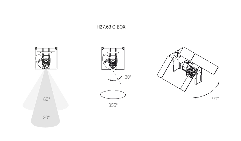 Das G-Box Modul verwendet eine im Bartenbach-Labor entwickelte LFO-Optik. Der Verteilungswinkel beträgt 30 oder 60 Grad. Die Position der Lichtquelle kann vertikal und horizontal eingestellt werden durch Kippen um bis zu 30 Grad oder Kreisen um die Achse um bis zu 355 Grad. Das Gehäuse lässt sich um 90 Grad öffnen und ermöglicht eine werkzeuglose Einstellung der Lichtquelle.