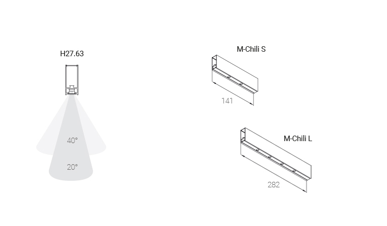 Die Profile der Serie H27 sind eine Erweiterung des kleinsten Profils der Serie U18, Sie sind als C-Anbauversion, S-Hängeversion und T-Einbauversion erhältlich. H27 sind die kleinsten in unserem Sortiment verfügbaren Profile, bei denen die Netzteile im Inneren des Systems installiert sind.