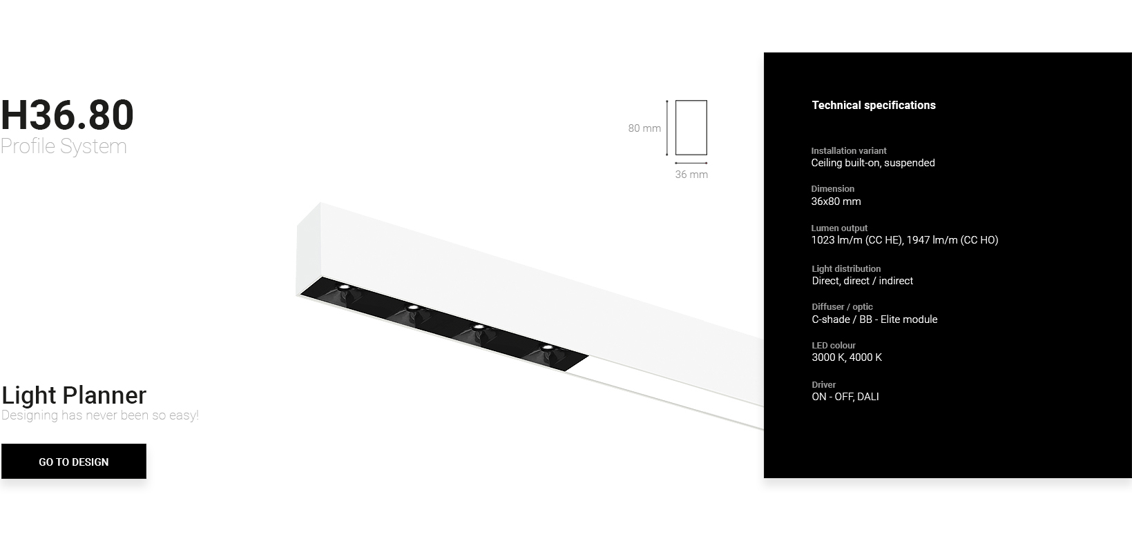 Die Profile H36.80 sind als eingebaute und abgehängte Versionen mit C-Shade-Diffusor und BB-Elite-Modulen erhältlich. Bei der abgehängten Version ist eine direkte/indirekte Lichtverteilung möglich.