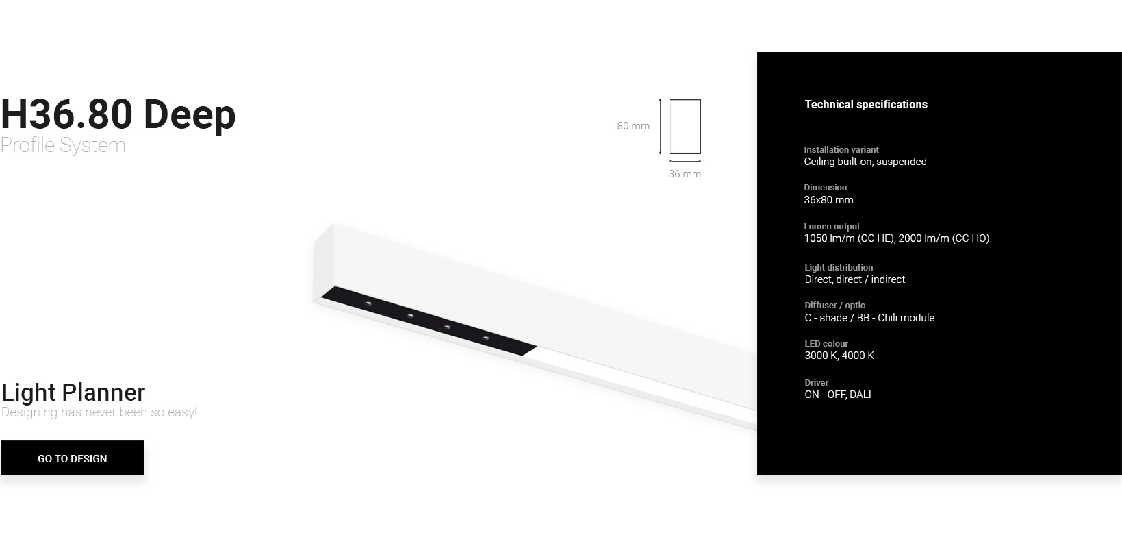 Die Profile H36.80 Deep sind als Einbau- und Hängeversion mit satiniertem Diffusor erhältlich und BB-Chili-Module. Bei der abgehängten Version ist eine direkte / indirekte Lichtverteilung möglich.
