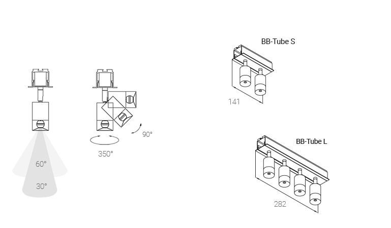 BB-Tube-Module verwenden eine im Bartenbach-Labor entwickelte LFO-Optik. Der Verteilungswinkel beträgt 30 oder 60 Grad. Die Lichtquelle kann vertikal und horizontal um bis zu 90 Grad gekippt oder um eine Achse um bis zu 350 Grad gedreht werden.