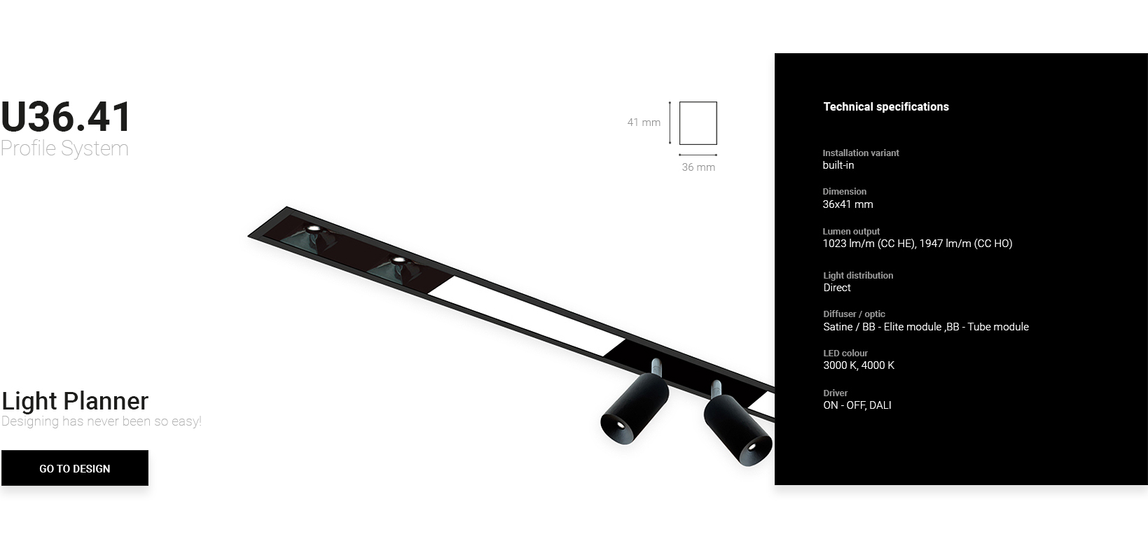 Die Profile U36.41 sind in einer eingebauten Version mit einem C-Shade Diffusorrahmen, BB-Elite-Modulen und BB-Tube-Modulen erhältlich.