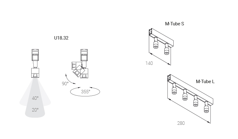 M-TUBE Module haben einen Abstrahlwinkel von 20 oder 40 Grad. Ihre Position kann durch Kippen um bis zu 90 Grad oder Drehen um die Achse um bis zu 350 Grad angepasst werden. Dieser Modultyp wird nur für die Profilserie U18.32 angeboten.