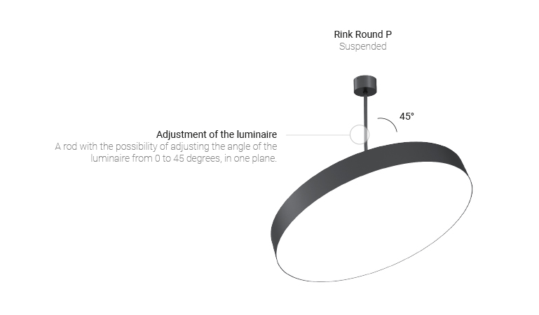 Die Montage an der Decke kann mit einer Stange und Leinen zur Einstellung der horizontalen Position der Leuchte oder nur mit einer Stange erfolgen, wobei der Winkel der Leuchte von 0 bis 45 Grad in einer Ebene eingestellt werden kann.
