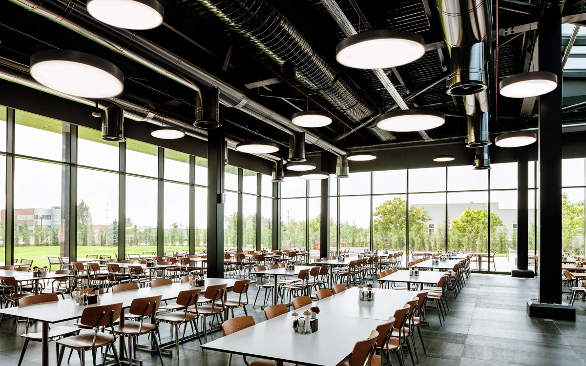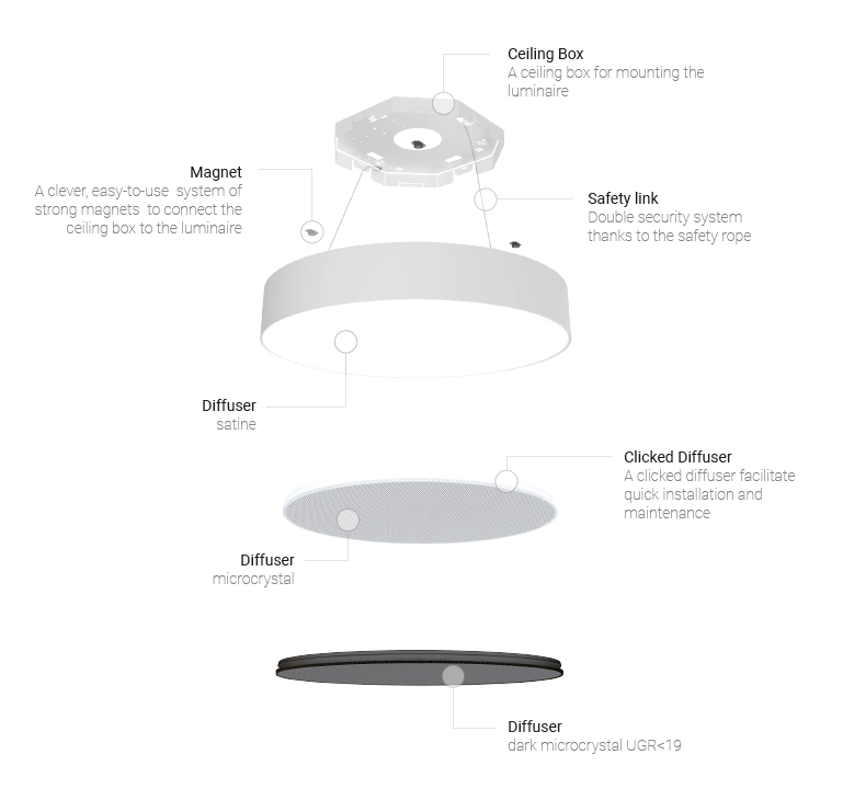 Der einzigartige Lichteffekt wird durch drei Arten von Diffusoren ermöglicht. Die innovative Befestigung, die in vier Varianten erhältlich ist, ermöglicht den Einsatz des Plafonds in allgemeinen Räumen wie Büros, Hotels, Schulen, usw.