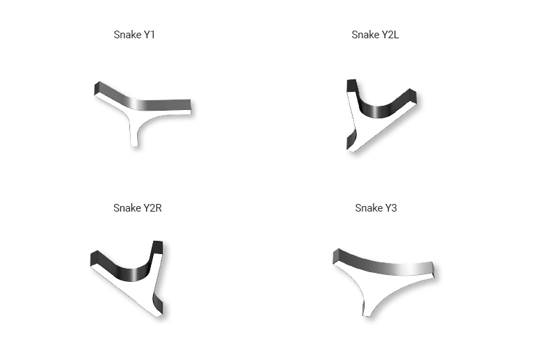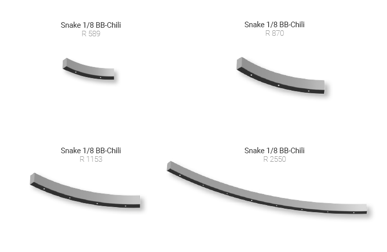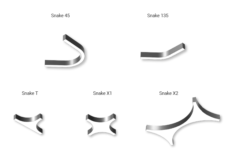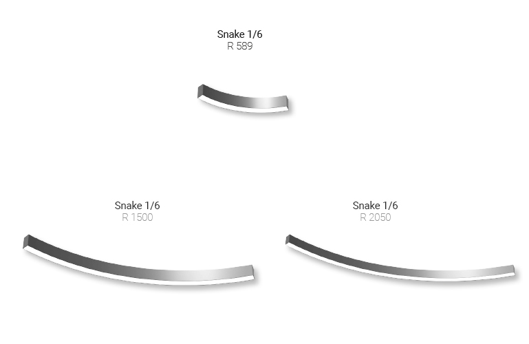 Sie können auch die Strahlermodule (BB - Chili) verwenden, um Leuchten zu schaffen, die sich um die Decke oder die Wand schlängeln. Es sind neunundzwanzig Formen erhältlich. Die Module gibt es in verschiedenen Größen und Formen, wie z. B. Kreisbögen, X, Y, Geraden und viele andere.