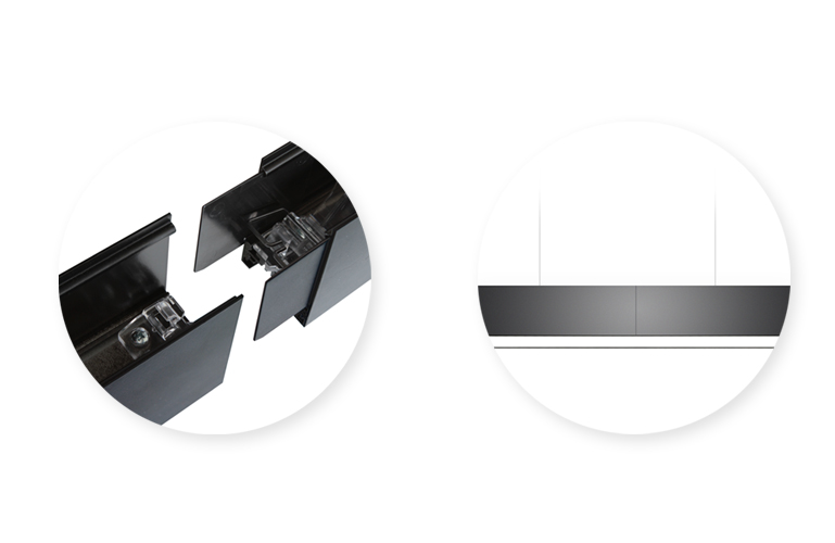 Dank der speziellen Blenden an den Verbindungsstellen der Profile wird das Durchscheinen der Spalten vollständig verhindert. Darüber hinaus ermöglichen diese Abdeckungen die Positionierung von zwei Modulen zueinander, bevor sie fest miteinander verbunden werden.