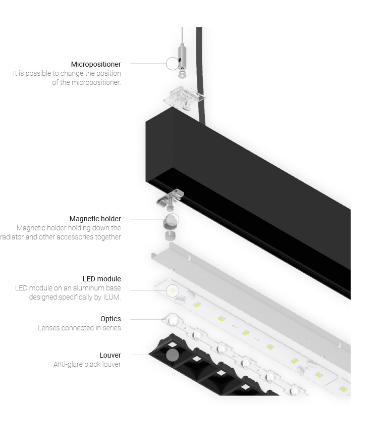 Sein Ziel ist es, mit der Modularität der verfügbaren Lösungen, dem schlanken Design und UGR<19 eine komfortable Arbeitserfahrung zu bieten. Zusätzlich zu den Standard-Leuchtenkonfigurationen ist es möglich, eine spezielle Lösung nach den Anforderungen des Kunden zusammenzustellen.