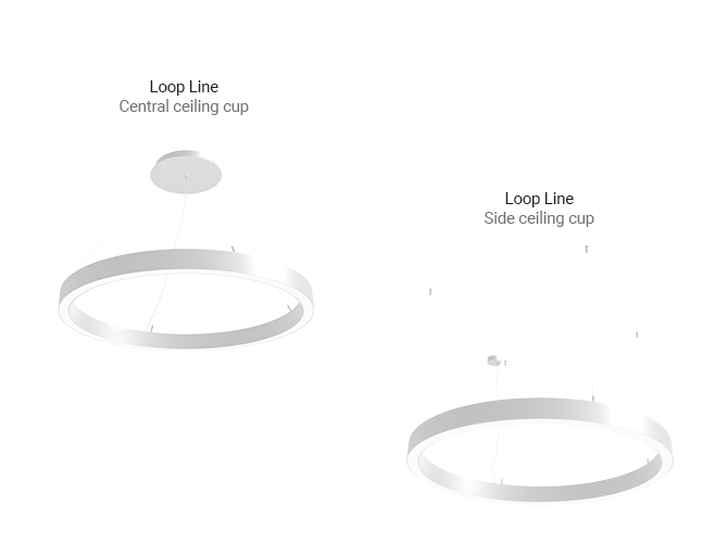 Loop profiles offer two options for suspended mounting: with a central or side ceiling box. Mounting with a central ceiling box is used for fixtures with a diameter of Ø 614 to Ø 1742 mm.