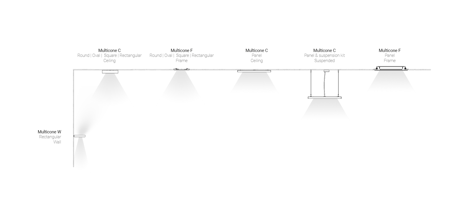 Four mounting types of Multicone fixtures help achieve the most imaginative arrangement of any room.