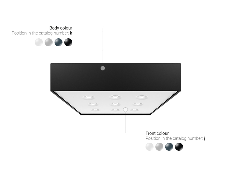 The Multicone fixtures are made of steel and are available in four colors: white, gray, graphite and black. The casing and front may have the same or different colours.