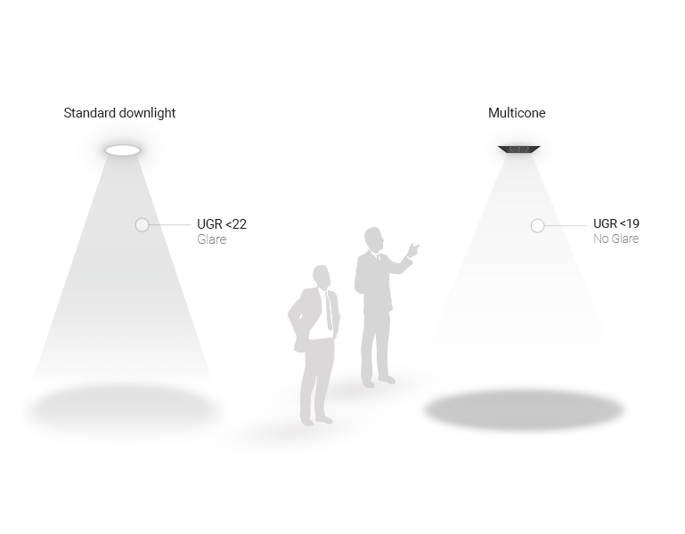 With low UGR (60° dispersion angle UGR < 19), glare is reduced and an exclusive lighting quality and total visual comfort are achieved.