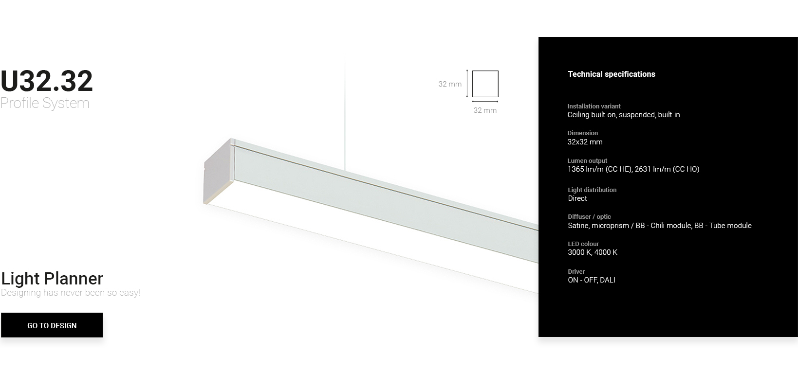 The U32.32 profiles are made of anodized aluminum or powder coated in white or black. Available with linear, BB-Chili, BB-Tube and system connectors. Satin or microprismatic diffusers are recommended.