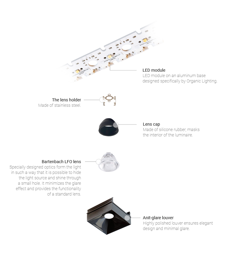 The BB-Elite is based on Bartenbach technology with 30 and 60 degree LFO optics and with an anti-glare raster.