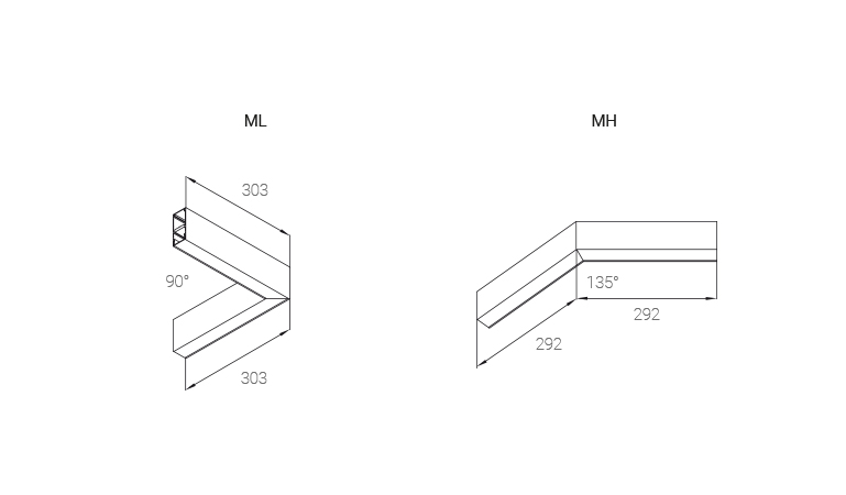 Connector designations refer to the shape of the letters of the alphabet or their arrangement against a surface, e.g. ML refers to the letter L. The MH connector refers to the horizontal alignment of two segments joined at 135 degrees.