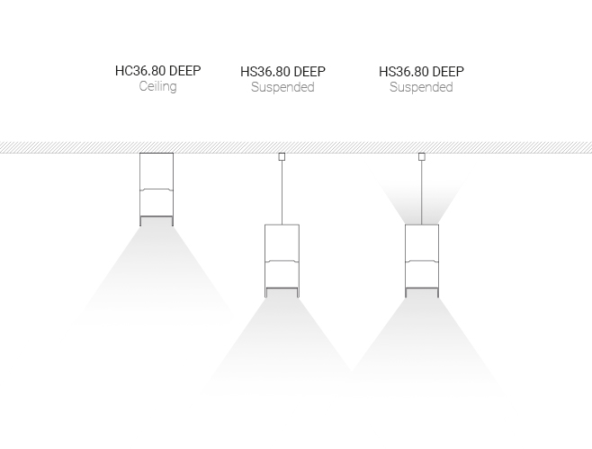 The H36.80 Deep profiles are available in built-in and suspended versions with a satine diffuser and BB-Chili modules. Direct / indirect light distribution is possible for the suspended version.