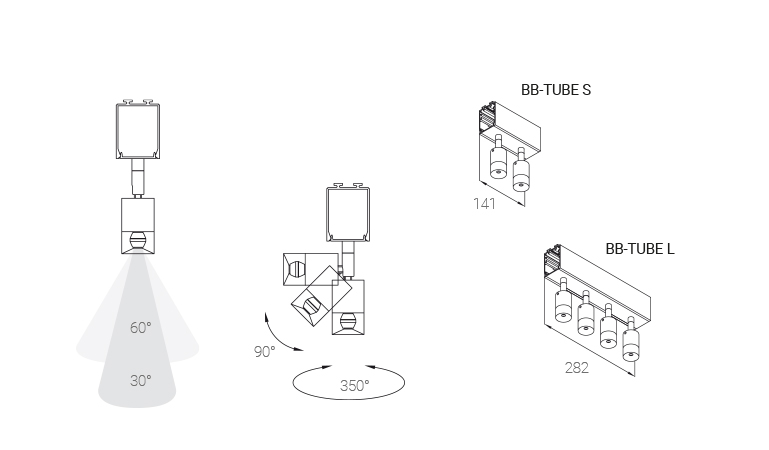 The BB-Tube module uses LFO optics developed in the Bartenbach lab. Beam spread angle of 30 or 60 degrees. The light source can be adjusted vertically or horizontally by tilting it up to 90 degrees or rotating them up to 355 degrees around their axis. Available for C, F, T mounting variants.
