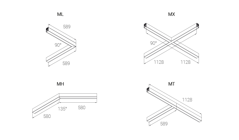 Connector designations refer to the shape of the letters of the alphabet or their arrangement against a surface, e.g. ML refers to the letter L, MX to the letter X, MT to the letter T. The MH connector refers to the horizontal alignment of two segments joined at 135 degrees. The connectors are available for the U50.68 profile series in the C, F, T mounting versions.