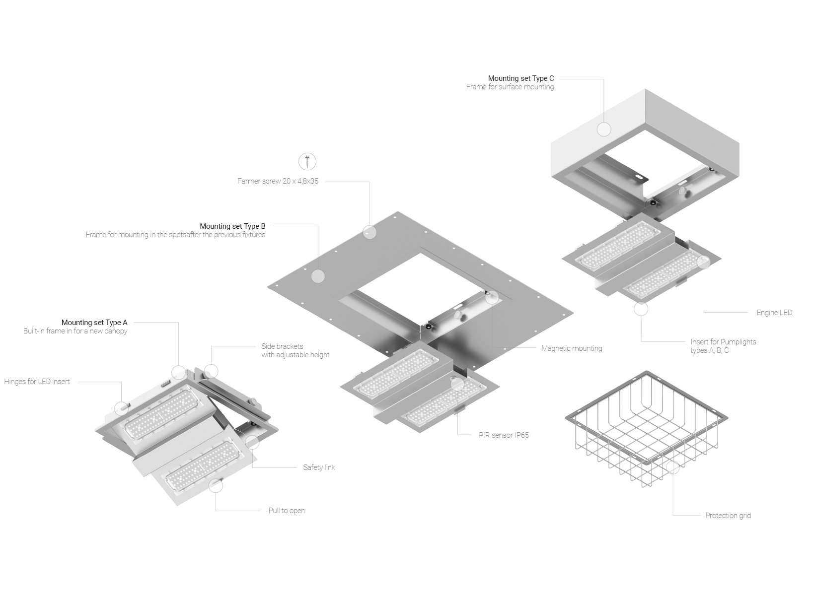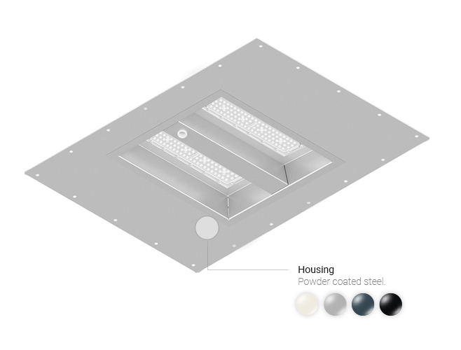Modular High Bay luminaire system dedicated to gas stations as well as industrial and sports solutions. The very high LED luminous efficiency of luminaires allows to achieve even greater savings in electricity consumption, increasing the efficiency of any lighting modernization project.