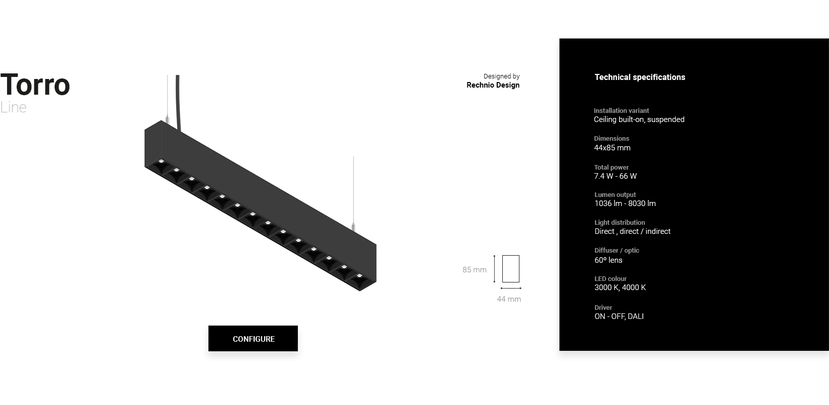 Its aim is to provide a comfortable work with the modularity of the available solutions, slim design and UGR<19. In addition to the standard luminaire configurations, it is possible to compose a dedicated solution according to customer requirements.