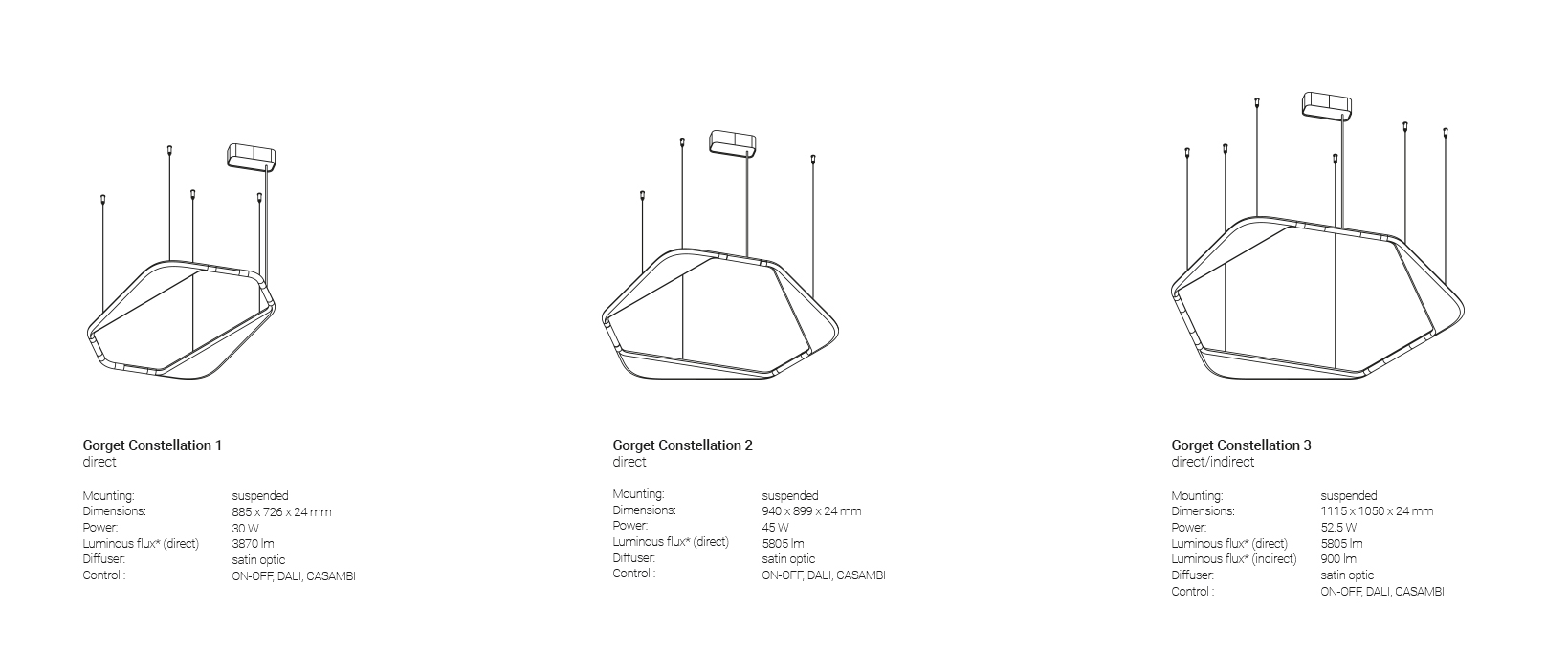 Kolekcja Gorget obejmuje również trzy zestawy zamknięte w kształcie pierścienia. Dzięki swojemu projektowi mogą być one przeplatane, tworząc unikalne wiszące dzieła sztuki. Wersja Constellation doskonale sprawdza się w dużych otwartych przestrzeniach, gdzie można zawiesić kilka pierścieni, jak również nad stołem konferencyjnym, gdzie kilka przeplatających się lamp oświetli przestrzeń podczas spotkań. Oprawa może także zawisnąć samodzielnie nad okrągłym stołem i pełnić rolę żyrandola.