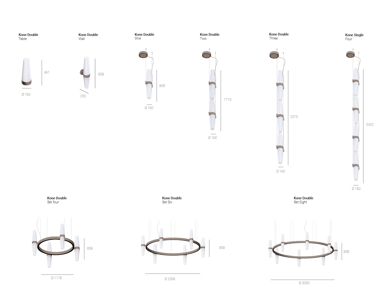 Seria Kone Double oferuje dwie różne wersje, z których każda charakteryzuje się innym źródłem światła oraz wykończeniem szkła. Wersja przezroczysta wyposażona jest w źródło światła LED umieszczone w rurze ze szkła borosilikatowego, połączonego z szkłem pokrytym powłoką PVD. Druga wersja wykorzystuje panel świetlny w połączeniu z matowym szkłem. Ta dualność stylów pozwala na kreowanie odpowiedniej atmosfery w każdym pomieszczeniu. Kolekcja Kone Double obejmuje różnorodne opcje, takie jak kinkiety, lampy wiszące i lampki stołowe, oferując wszechstronne rozwiązania oświetleniowe do różnych przestrzeni. Dla mniejszych aranżacji domowych zaprojektowano dedykowaną wersję lampy – Kone Mini.