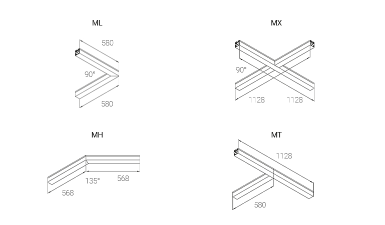 np. ML do litery L, MX do litery X, MT do litery T. Natomiast łącznik MH nawiązuje do poziomego ułożenia (z ang. horizontal) dwóch odcików połączonych pod kątem 135 stopni. Łączniki dostępne są dla serii profili U32.32 w wersjach montażu C, S, T.