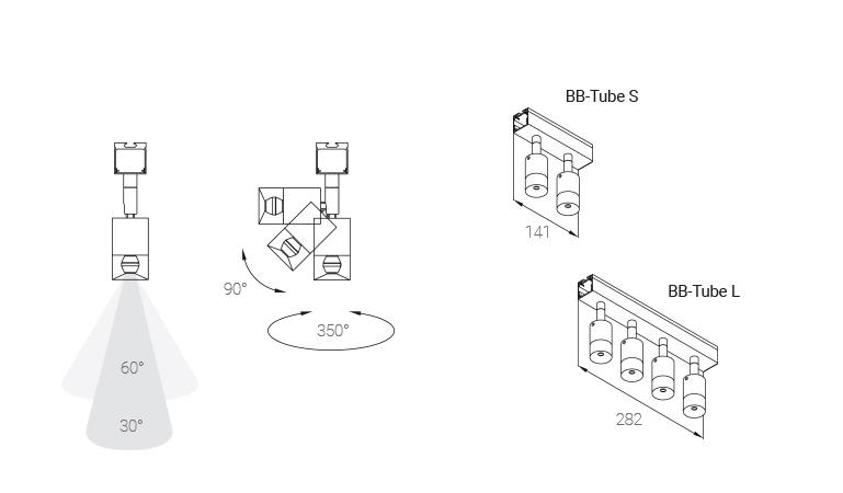 Moduł BB-Tube wykorzystuje optykę LFO opracowaną w laboratorium Bartenbach. Kąt rozsyłu 30 lub 60 stopni. Żródło światła można regulować w płaszczyźnie pionowej i poziomej poprzez odchylenie do 90 stopni lub okręcenie wokół osi do 350 stopni. Dostępne dla wariantów montażowych C, S, T.