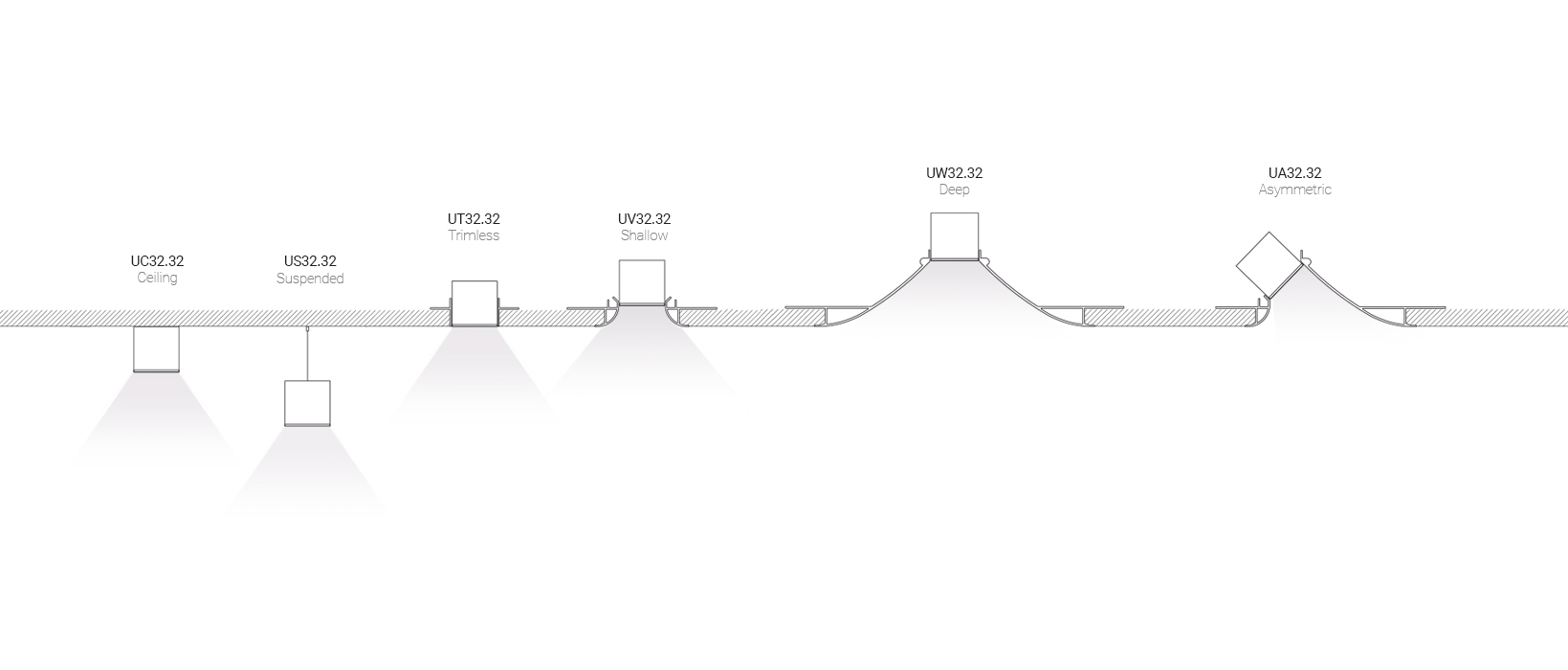 C nabudowany, S zwieszany, T wbudowany bezramkowy, V wbudowany płytko cofnięty, W wbudowany głęboko cofnięty, A wbudowany asymetryczny.