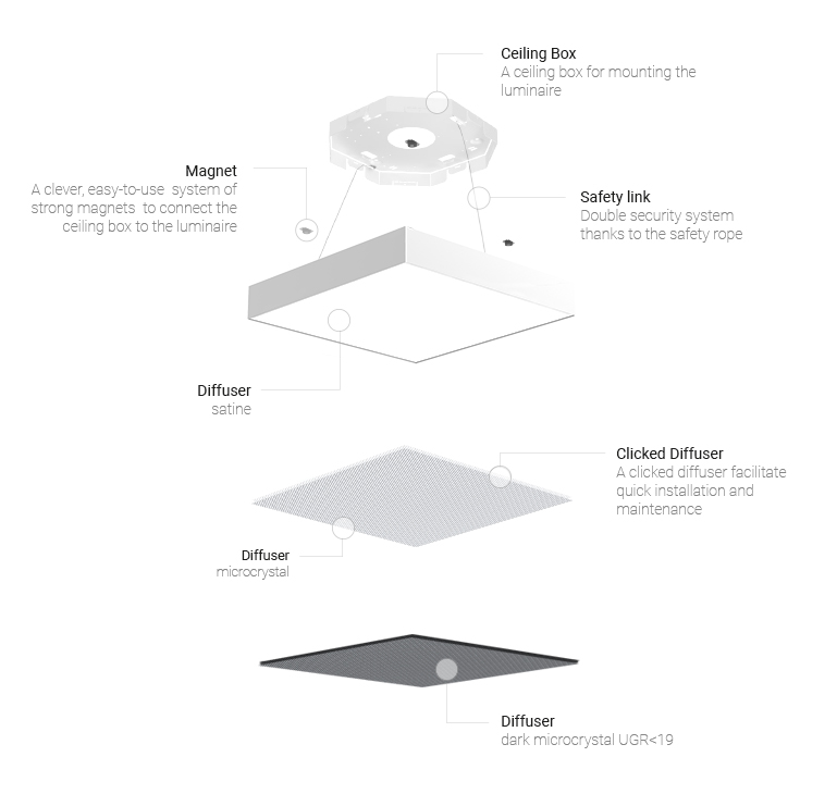 Wyjątkowy efekt świetlny możliwy do uzyskania dzięki zastosowaniu trzech rodzajów dyfuzora. Innowacyjne zamocowanie dostępne w czterech wariantach montażu pozwala na zastosowanie plafonów w pomieszczeniach ogólnego zastosowania jak biura, hotele, szkoły, itd.