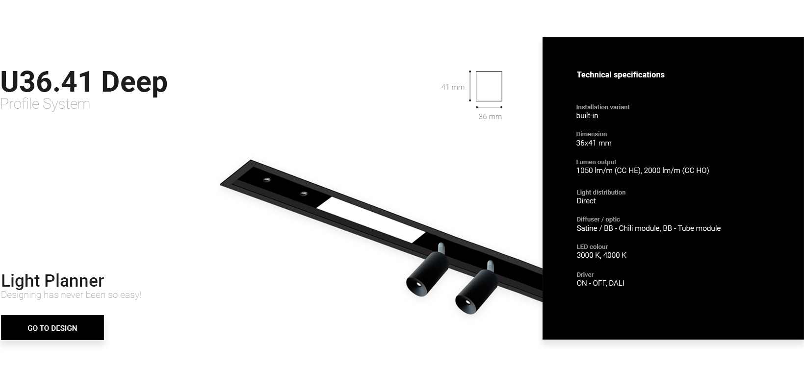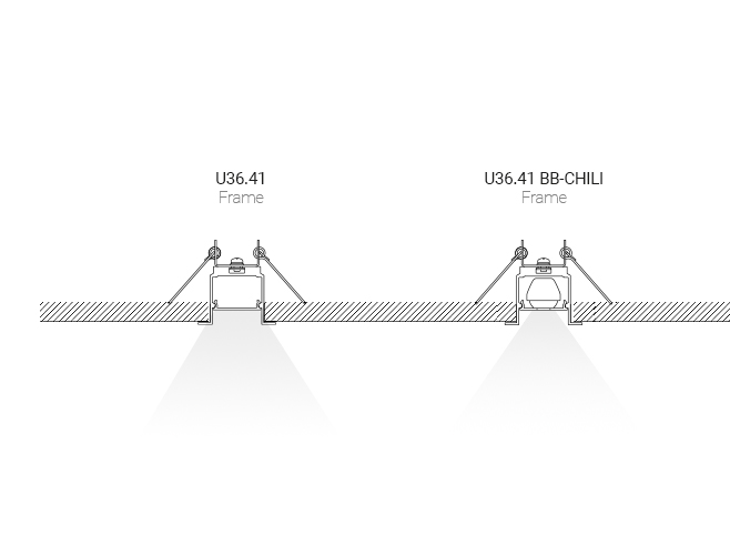 The U36.41 Deep profiles are available in an built-in version with a frame with a satin diffuser, BB-Chili modules and BB-Tube modules.