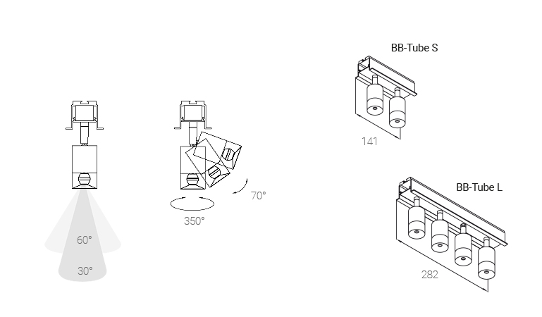 The BB-Tube module uses LFO optics developed in the Bartenbach lab. Beam spread angle of 30 or 60 degrees. The light source can be adjusted vertically or horizontally by tilting it up to 70 degrees or rotating them up to 355 degrees around their axis.